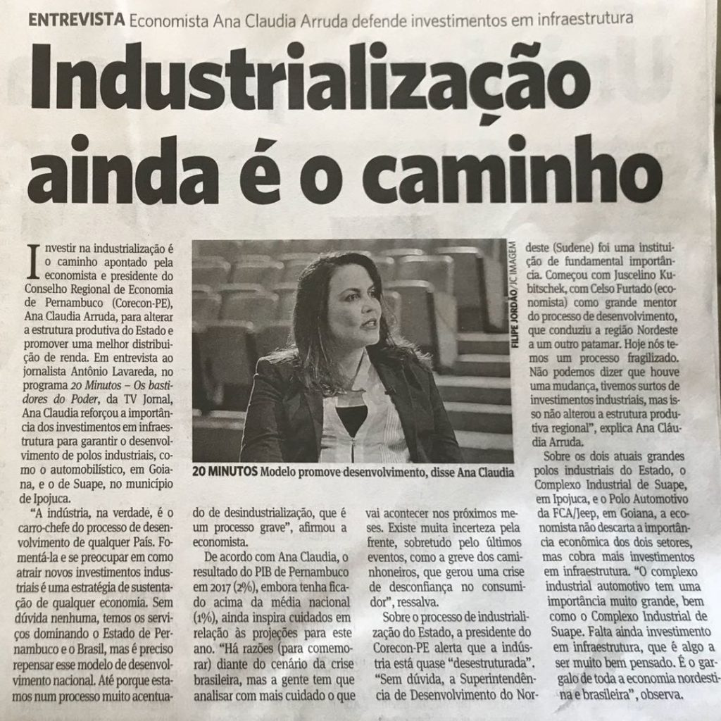 A presidente do Conselho Regional de Economia de Pernambuco (Corecon-PE), Ana Cláudia Arruda Laprovitera, participou, no último sábado, 30 de junho, do programa 20 Minutos, exibido pela TV Jornal e apresentado pelo cientista político Antônio Lavareda. A economista abordou o crescimento econômico do estado e a necessidade de diversificar a base produtiva de Pernambuco. Clique na imagem abaixo para conferir a entrevista na íntegra.